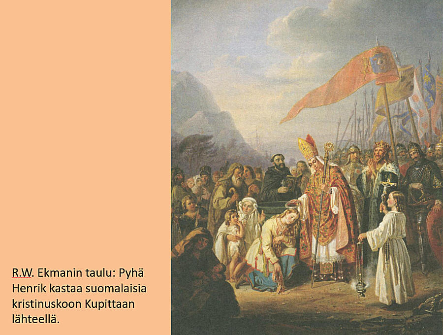 D. Mistä ja miten Kristinusko tuli Suomeen D1. Kristinuskon tulo Suomeen on perinteisesti esitetty Eerikin kronikan tapaan ruotsalaisten ristiretkenä 1155 (1157). Taustalla olisi silloin roomalaiskatolinen kirkko.