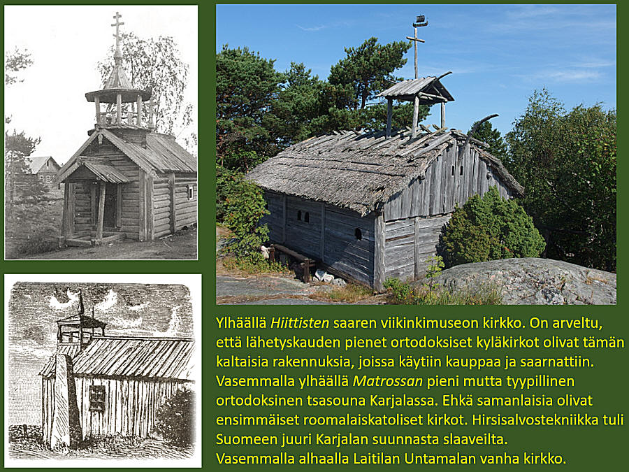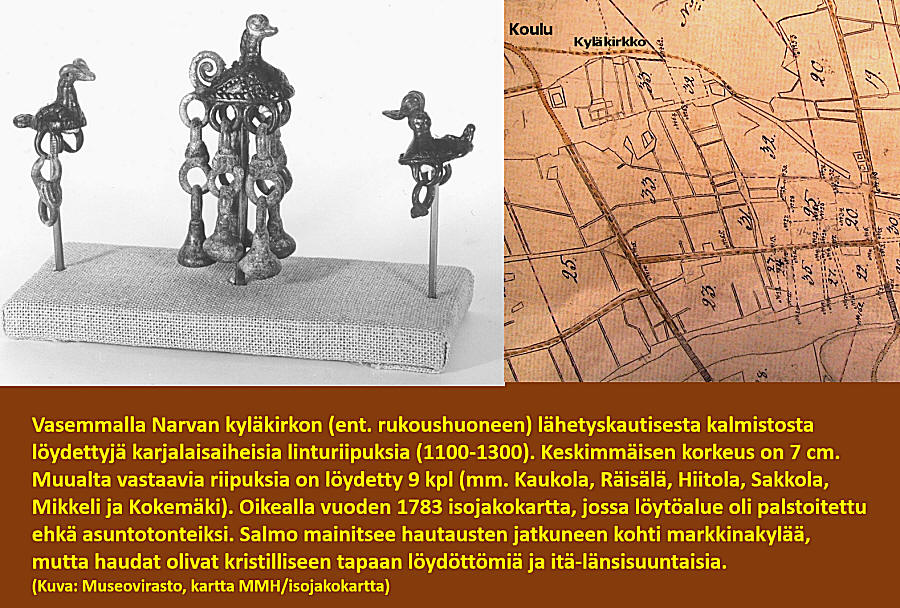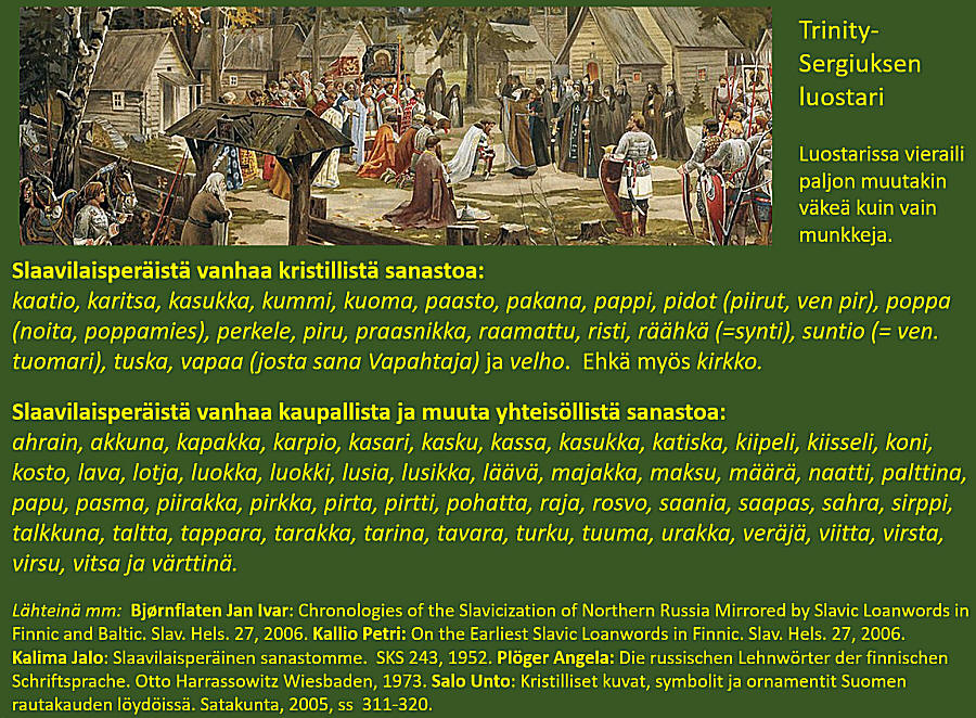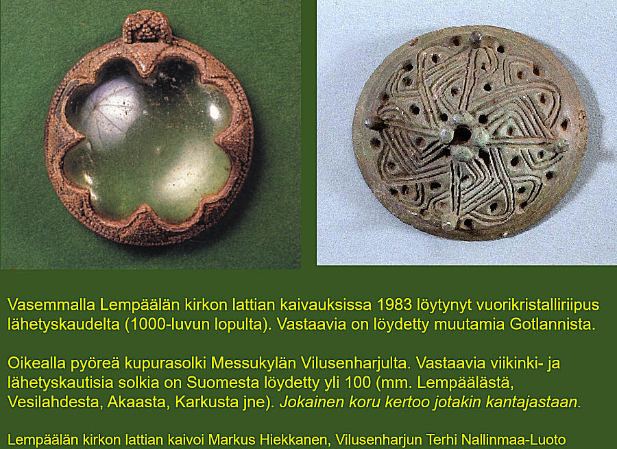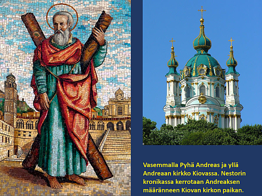 D2. Henrikin legenda koottiin ehkä joskus 1200-luvun lopulla kirkollisen liturgian osaksi. Legendasta on olemassa useita kopioita ja versioita. ![]() D3. Toinen vaihtoehto on idän kreikkalaiskatolinen eli ortodoksinen kirkko, jonka tärkeimpiin pyhimyksiin ('pyhiin') kuuluu Pyhä Andreas: ![]() D4. Ortodoksisia koruja Lempäälästä ja Messukylästä: ![]() D5. Narvan kyläkirkon hautasmaalta löydettyjä itäisiä linturiipuksia: ![]() D6. Suuri osa kristillisestä sanastosta on peräisin kirkkoslaavista (700-800-luvuilta alkaen), jota ortodoksikirkko käyttää yhä liturgiassaan. Katolinen kirkko hyväksyi asiaa sen paremmin ajattelematta sanaston suomalaisena. ![]() |