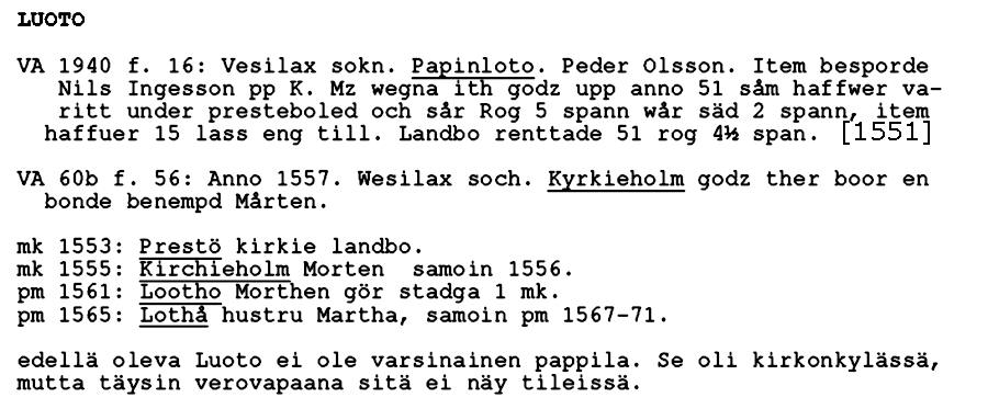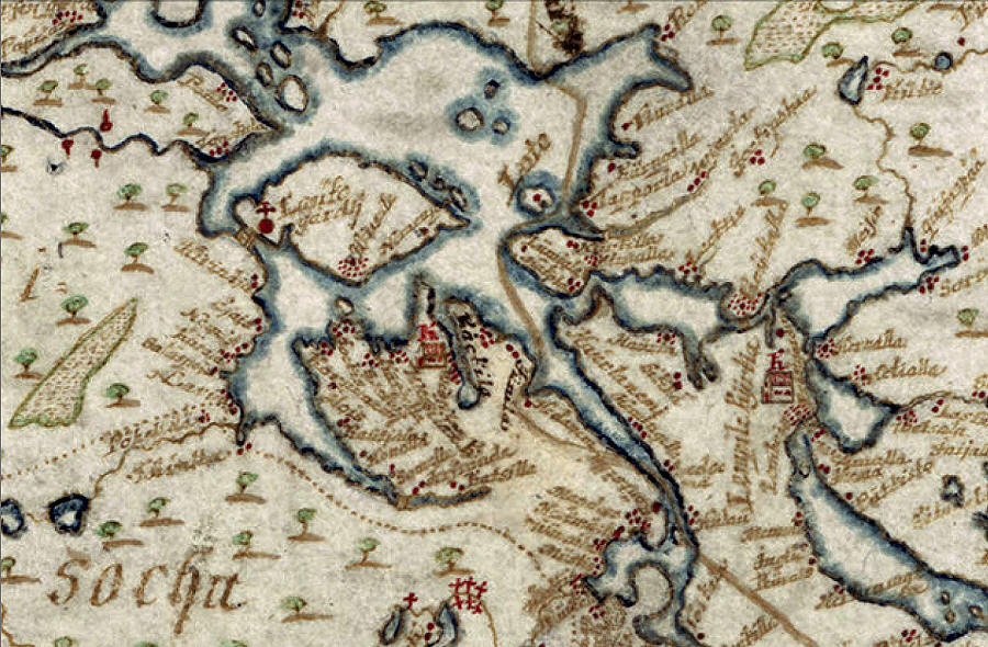 E. Roomalaiskatolisen kirkon tulo E1. Kuusiston linnan (1290? - 1528) raunioita. Kuningas Kustaa Vaasan käskystä piispa Arvid Kurjellekin tutuksi tullut linna hajotettiin. ![]() E2. Kirkon paikan valinta on edellyttänyt kompromissia: ![]() E3. 1600-luvun kartassa Luodon saari (Loto) oli vielä osa Vesilahtea. Lempäälään se ilmeisesti siirtyi isojaon myötä: ![]() E4. Alla Seppo Suvannon keräämät tiedot 1500-luvun asiakirjoista: ![]() E5. Vuonna 1699 Luoto on jo luettu ainakin alla olevassa kartassa Lempäälään. ![]() E6. Keskiajalla kirkot rakennettiin useimmiten saariin. Tässä Köyliön kirkkosaari, jonne Messeniuksen mukaan rakennettiin kirkko Pyhän Henrikin muistoksi. Pienellä saarella on todella ollut kirkko: ![]() E7. Kun ortodoksinen usko levittäytyi yksittäisten munkkien, kauppiaiden ja saarnaajien mukana ja yleensä pieninä yksikköinä, niin roomalaiskatolinen kirkko rakentui armeijan tapaan ylhäältä alaspäin: ![]() |