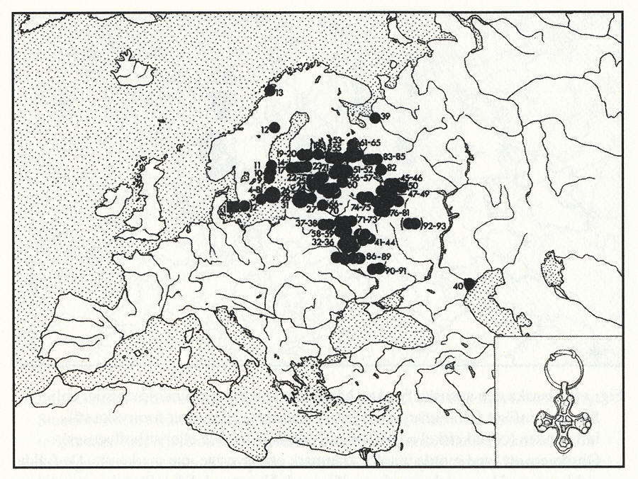 ![]() C4. Euroopan kauppareitit yli 1000 vuotta sitten. Vilkkain reitti oli viikinkien, varjagien ja rusien reitti Pohjolan ja Bysantin välillä. Kasaarivaltioon päästiin Volgan kautta. ![]() C5. Hansajärjestön kauppareittejä: ![]() C6. Kaupan ja kulttuurien suomalaisia reittejä rautakaudella ja keskiajalla: ![]() C7. Kristinuskon merkkinä on pidetty ristiä, joka on erilainen idässä ja lännessä. Kartassa on hyvin yleisen itäisen ristiriipuskorun levintä Venäjällä, Suomessa ja Ruotsissa myöhäisrautakaudella. Tällaista tasavartista ristiä sanotaan myös kreikkalaiseksi ristiriipukseksi ja se on yleinen Bysantin vaikutusalueella. ![]() Karttapiirros kirjasta: Janson Henrik, 2005 |