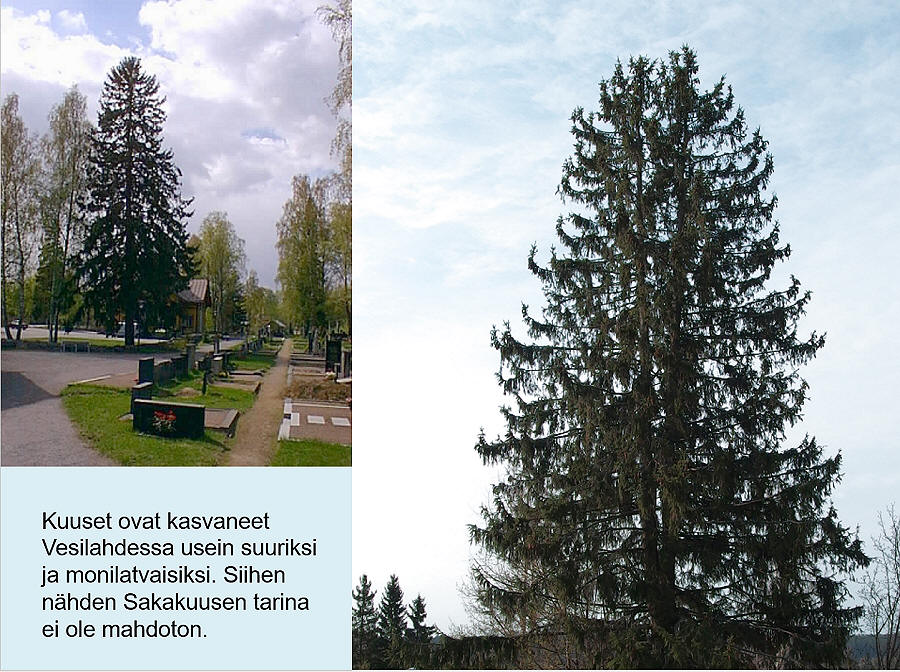 E9. Vesilahden ensimmäinen tunnettu kirkkoherra Benedictus Thomae (1346) tunsi hyvin piispa Hemmingin, joka taas oli ruotsalaisen pyhän Birgitan hyvä ystävä. Birgitan asema Vesilahdessa oli korkealla. Jakautuneen seurakunnan itäinen osa Lempäälä sai sen suojelijakseen. F. Aimalan kirkko ja Sakakuusi Satalatva F1. Tarinan mukaan Vesilahden kirkonmäellä kasvoi Sakakuusi Satalatva. ![]() F2. Lempäälän kivikirkko ehti valmistua 1500-luvun alussa, mutta Vesilahdessa ilmeisesti suurempi kirkko jäi puolivalmiiksi. Sen sisällä ollut vanha kirkko paloi 1602. Muistoksi jäi vain iso kivinen sakaristo: ![]() |