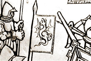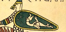 ![]() Suomalaisten tunnuksena Pyhän Henrikin sargofagissa kuvattu kaksijalkainen lohikäärme, englanninkieliseltä nimeltään Wyvern, oli myös varhaiskeskiaikaisen Wessexin kuningaskunnan tunnus (kuva yllä). Kaksijalkaista lohikäärmettä on nimitetty ranskan, saksan, venäjän, espanjan ja italian kielissä heraldiseksi lohikäärmeeksi. Walesinkielinen wyvern, jota käytetään englannissa, tarkoittaa alunperin matoa. Wessexin kuningaskunta kasvoi myöhemmin käsittämään koko Englannin ja se on siten koko brittiläisen imperiumin alkujuuri. (Wessex < Westseaxe eli läntiset saksit) ![]() Kuningas Arthurin vaakuna myöhäiskeskiajan ranskalaisessa heraldiikassa. Kilvessä on 13 kruunua, kilvenkannattajina kaksi koiraa, kilven kypärä on kruunattu ja siitä roikkuu kuninkaallinen kärpännahkaviitta. Kypärän yläpuolella lohikäärmeen pää. Sana pendragon eli lohikäärmeen pää tulee Walesissa puhutun kymrin kielen sanoista pen (pää) ja draig (lohikäärme). Ilmaisun merkitys on "ylikuningas". Kuvalähde: Lacy Norris J., Ashe Geoffrey, Mancoff Debra N.: The Arthurian Handbook. Garald Publishing Inc, 1997. Piirros: Helmut Nickel Katso myös: Ikuturson levikki Kalevanpojat |