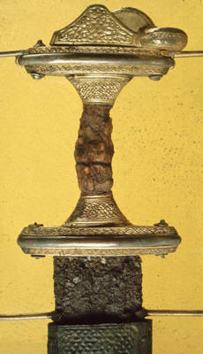 loistomiekan kullattu kahvaosa. Oikealla puolella osasuurennos rengasmiekan