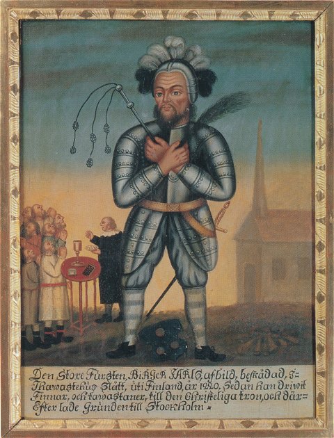Värillisen taulun ruotsinkielisessä tekstissä sanotaan: Suuren ruhtinaan Birger-jaarlin muotokuva, kuvattuna Hämeenlinnassa, Suomessa, vuonna 1220, sen jälkeen kun hän oli pakottanut suomalaiset ja hämäläiset kristilliseen uskoon ja sen jälkeen perusti Tukholman.