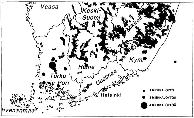 Ulfberht-miekkojen löytöpaikat Suomessa (Räty 1998)