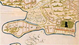 Hinsalan tiheä kyläryhmä maakirjakartassa vuodelta 1701. Kylän 10 taloa sijaitsevat oikeassa alareunassa. Niemenpää kuvasta oikealla ja Laukko vasemmalla.