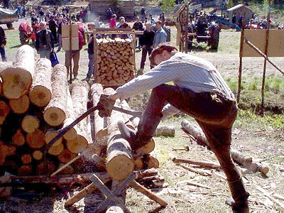 Hei mies, tämän saisi poikki moottorisahallakin! Tai sirkkelillä tai metsäkoneella! Ja sitä paitsi halkoja ei enää tarvita lämmitykseen! Vanhanaikaista! Ehdotus ei kelpaa, ei alkuunkaan. Mies ei sahaa toimeentulonsa vuoksi eikä halot mene lämmitykseen vaan höyrykoneen voimaksi. Katsokaa tuota halkomottia taaempana: se on taideteos! Näitä työtaideteoksia on ilmestynyt Rämsöön ulkopuolellekin. Miehelle tämä on oiva harrastus ja todellista hyötyliikuntaa ruumiin ja sielun ylläpidoksi. Sietäisi monen muun ottaa opiksi! Näytteillä on myös joukko metsurin "käsiaseita": sahoja, kirveitä, kuorimarauta, tukkisakset jne. Kuinkahan monen käteen vielä sopisivat? Uusavuttomat etsisivät luottokorttia ja kysyisivät, että mitä maksaa, jos joku tekisi....