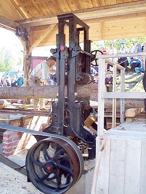 Niin, palataanpas siihen ydinvoimaan, jossa energia synnytetään ja valvotaan keskitetysti. (Kuvaaja ei osaa eikä haluakaan ottaa kantaa ydinvoimaan.) Tässä kuvassa on vanha kunnon raamisaha (kehäsaha), jota käyttää aito höyrykone. Kaikki energia syntyy paikan päällä. Operaatio ei ole millään tavalla riippuvainen globaalista energianhuollosta. Kun vielä koneiden rakennus- ja korjaustaito on paikallista, on kysymyksessä aito omavaraistalous. Hammaspyörät vetävät tukkia ja pystysuorassa liikkuvat terät sahaavat puusta kauniita lautoja ja lankkuja. Tukit kulkevat kiskovaunun päällä ennen ja jälkeen terien. Jos vielä puut ovat omasta metsästä, ei voi tulla kalliiksi! Kaiken kukkuraksi työporukalla on hauskaa!