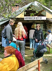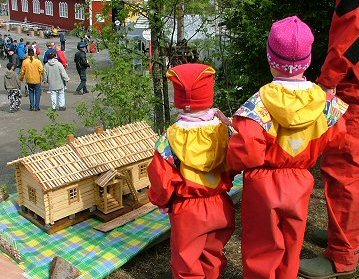 Niinimäen torppa rakennuksineen kiinnosti myös pikkuväkeä. Toinen Tauno oli väsännyt vanhasta kodistaan pienoismallin. Katto ei sitten ole mikään tiilikaton karrikatyyri, vaan se on malkakatto, jossa alla on tuohikerros ja päällä ovat pitkät puiset malaat tuohia tukemassa. Katto kestää iät ja ajat tuulia ja tuiskuja - mutta ei tulitikkua. Puron varrella oli lisäksi Lanan vanhan vesimyllyn tarkka pienoismalli.