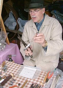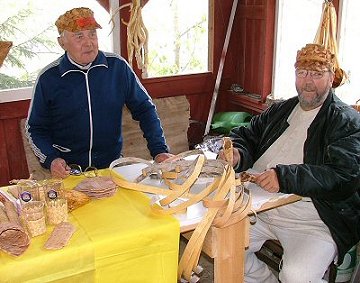 Kaksi Taunoa (Niinimäki ja Kirstua), joiden peukaloita ei näy, mutta kuvaaja voi vakuuttaa, että ne eivät ole keskellä kättä. Miehet ottavat kasan tuohta tai mitä nyt ottavatkin, vääntelevät sitä hetken ja esittävät hetken kuluttua hyötyesineen. Oikeanpuoleinen Tauno näpräsi mm. kännykkäkotelon. Tuohi jos mikään tarjoaa materiaalia niin käsille kuin luovalle mielikuvituksellekin. Kädethän meillä kaikilla on, mutta kun tarvittaisiin sitä jälkimmäistäkin ...