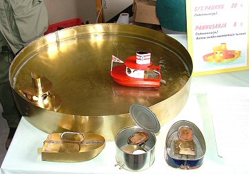 Seuraava aste kaarnaveneestä! Raaka-aineena näkyy käytetyn mm. vanhoja säilyketölkkejä, joita on tinattu veneen muotoon. Voimanlähteinä ovat tavalliset kynttilätuikut. Jotenkin ne saavat aikaan sen, että paatit vipeltävät ja potpottavat vauhdilla altaassa. Yleensähän vanhojen säilyketölkkien normaali reitti johtaa kaatopaikalle tai parhaimmassa tapauksessa peltiromujen keräilyastiaan. Tarvitaan melkoista luovuutta ja kansalaisrohkeutta olla heittämättä "jätettä" sinne, mihin se normaalin kaavan mukaan "kuuluu".