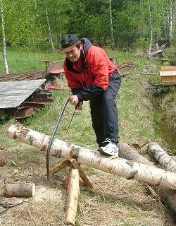 Tietenkin vaaditaan tietty määrä varovaisuutta, ettei käy niin kuin tälle miehelle, joka meni - ilmeisesti kädet housujen taskussa - liian lähelle puutyöpistettä. Työnäytöksen ohjaaja katseli ja mittaili hetken miestä, totesi piilevät voimavarat - ja antoi sahan käteen: "Katko sinä nyt aikasi kuluksi nuo koivut pölkyiksi. Niitä tarvitaan aivan kohta höyrykoneiden voimanlähteiksi!" Juu. Kuvaaja ei ikävä kyllä ehtinyt tutustua tilanteeseen tarkemmin, mutta jonkinlainen ajatus jäi kytemään: Voisiko sitä antaa yleisölle enemmänkin mahdollisuuksia kokeilla ja testailla omia kykyjä kowan teknolokian taidoissa? On kai niin, että tuollaisellakaan "modernilla" sahalla ei enää ole sahannut kuin häviävän pieni ihmismäärä. Ja mitä kaikkia koneita ja työtapoja olisikaan kokeiltavissa. Silloinhan tuo teknolokia vasta todella avautuisi. Siihen ikään kuin eläytyisi. Työturvallisuuslaki taitaa kuitenkin tulla heti ja lähes joka paikassa vastaan. Pokasahassakin on terä näkyvillä - siis kielletään! Ei ihmisiä saa opettaa taitoihin ja varovaisuuteen. Haloo, jos tätä menoa jatketaan, vain kaukosäädin ja sohva ovat sallittuja.