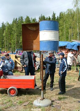 Sitten vielä huokea tuulimylly: vanha tynnyri on halkaistu keskeltä kahtia ja puoliskot kiinnitetty metallitankoon. Tietenkin tuuli sitä pyöritti! Merkittävää on lisäksi se, että tuuli voi käydä mistä suunnasta tahansa - aina pyörii. Ei mikään voimanpesä, mutta nyt on oleellista, että lamppu on jollakulla välähtänyt. Odotettavissa on myös, että naapuri katselee nenänvarttaan pitkin - ja panee paremmaksi. Sääasemien 4-kuppiset tuulimittarit muuten toimivat samalla periaatteella. Kuka muuten muistaa, miksi tynnyreitä ennen vanhaan tai ehkä vieläkin halkaistiin kahtia? Tynnyrin puolisko kiinnitettiin puualustaan ja puoliskoon kaadettiin muutama litra petrolia. Tämän ammeen mustuneessa nesteessä sitten pestiin - viikosta toiseen - korjattavana olevat metalliosat. Ruoste, rasva ja kura irtosi, ja todella puhdasta tuli.