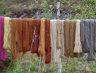 Ja mitä onkaan tuloksena! Sen värisiä lankoja, että niistä taitava kutoja tekee hameen, raanun, ryijyn tai liinan, joka oikeastaan heti pitäisi asettaa taidetekstiilimuseon vitriiniin. Värit eivät ole nykyajan yksinkertaisia perusvärejä, vaan rikkaasti murrettuja pastellisävyjä. Vesilahti muuten on Suomen tunnetuimpia ryijy- ja raanupitäjiä. Ilmeisesti tällä tavalla paikkakuntalaiset muinoin värjäsivät komeiden ryijyjensä langat. (Huomaa, että kuvaajan mainio digitaalikamera ja oma loistokuvaruutusi eivät riitä toistamaan värejä riittävän hyvin.)