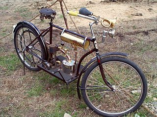 Tämä taas ei ole juomatankilla varustettu polkupyörä, vaan mopedin prototyyppi, moottoripolkupyörä. Ilmeisesti se kulkee verkkaisesti pienen bensiinimoottorin avustuksella. Jos bensa loppuu, niin sitten kai vain poljetaan tavanomaisesti. Ajoneuvo oletettavasti on jopa vaarallinen, koskapa se on varustettu huomattavan suurella äänimerkinantolaitteella. (Mitähän mieltä Vanhojen Velojen kerho on tästä kapistuksesta?)