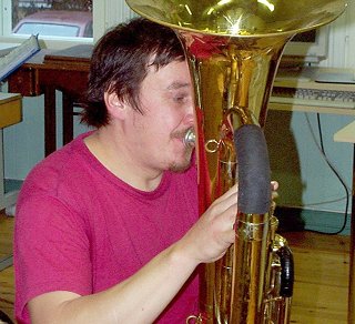 Tuuba on kuitenkin niin iso vekotin, että sen soittajana pitää olla oikein "miäs", jolla on kanttia bhuhaltaa. Ääni on möreän matala ja koko orkesterin kivijalka. |