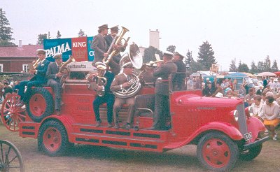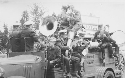 Soittajat paloautossa ovat oikealta lukien Orvo Velinen rummut, Erkki Hyvätti alto,