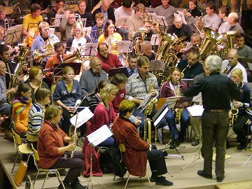 Narvan Soittokunnan 100-vuotisjuhlakonsertissa oli myös St. Georgenin puhallinorkesteri Saksasta. Tässä narvalaiset ja st.georgenilaiset saksalaisen kapellimestarin ohjauksessa.