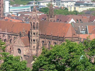Freiburgin tuomiokirkko. Korjattavana oleva iso torni ei näy.