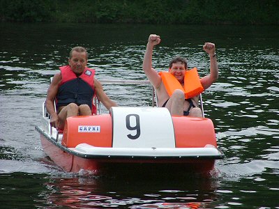 Paluumatkalla vesiputoukselta kävimme Tonavan alkulähteillä. Siis sanan varsinaisessa merkityksessä: ajoimme ohi lammen, josta Tonava saa alkunsa. Eipä sitä säästytty ampumavälikohtaukseltakaan. Penttilän Maunoa ammuttiin suoraan kohti. Mutta onneksi se olikin pienen italialaispojan vesipyssystä peräisin. No tämä tapahtui jo kun lähdettiin aamulla matkaan. Lehdistökin on huomannut vierailun. Kuvia ja juttuja etusivusta lähtien. "Pastailta" Klosterweiher'in Seehaus ravintolassa. Ennen ruokailua oli pienet polkuvenekilpailut. Ali Baba soitti illan vietteeksi. Musiikki oli aivan loisteliaan mahtavaa sooloineen kaikkineen. Paikalla oli myös tänään saapunut virallinen valtuuskunta, siis ne jotka eivät vielä aiemmin olleet täällä. Olipa illalla oikein kunnon ukkosmyräkkäkin.