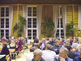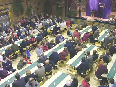 Seurojentalon juhlasalissa ovat paksut hirret näkyvissä joka puolella, mikä tekee salista poikkeuksellisen juhlavan.