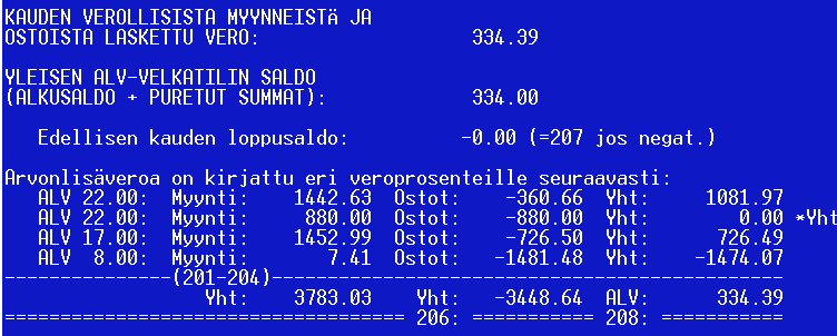 Jos alennus määritetään ja annetaan vain tietyille asiakkaille, merkitse ALV-prosentin jälkeen lista näistä asiakasnumeroista (&LpAle -2 22 4522 4523 2549). Muutoin kysymys tehdään tulostuksen yhteydessä kaikille.28.05.2001: Kirjanpidossa korjattu ALV-laskelman yhteisöostojen tulostusta. 27.05.2001: Sisäinen muutos tiedostojen lajitteluohjelmaan. 23.05.2001: Korjattu ALV-keruutilastoon ilmaantunut virhe, jonka vuoksi summat kääntyivät päinvastaisiksi. Kaikkien kirjanpito-ohjelmaa käyttävien kannattaa imuroida uusi versio - etenkin jos ALV:t ovat käytössä! Mikäli edelleen ilmenee ongelmia, ilmoita! Alla kuva ALV-tilastosta. Ohjelman laskeman ALV:n ja käyttäjän keräämän ALV:n määrän pitäisi olla likimain yhtä suuret (tässä tapauksessa aivan samat, mikä on harvinaista). Penniero johtuu yleensä pyöristyksistä kirjausvaiheessa. Positiivinen luku on maksettavaa, negatiivinen seuraavalle kuulle siirtyvää vähennettävää. Yleisen ALV-velkatilin saldo on tässä tapauksessa sama kuin ALV-velka, mutta jos edellisessä kuussa on ollut vähennettävää tai koko saldoa ei ole maksettu, summat eroavat. Huomaa, että yhteisöostojen kohdalle ohjelma merkitsee *Yht.