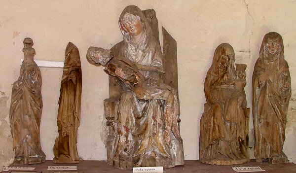 Keskiaikaisia veistoksia Vesilahden kirkon museossa. Vasemmalla madonna (pitää käsivarrellaan kiharatukkaista Jeesusta, koivua), sitten tuntemattoman pyhimyksen osa (tammea), keskellä Pietaa-ryhmä (koivua 121 cm) ja oikealla Anna-ryhmä. Pietaa -ryhmä kuvaa Kristuksen ristiltä ottoa; Neitsyt Maaria pitää sylissään Kristusta. Koivupuinen veistos lienee hankittu Turusta. Pyhä Anna pitää polvellaan Neitsyt Maariaa, joka taas pitää sylissään Jeesus-lasta (ei näy enää veistoksessa).